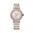 Lvcea watch with automatic movement, hours, minutes and seconds functions, 33 mm polished stainless steel case, 18 kt rose gold bezel set with round brilliant-cut diamonds, white mother-of-pearl intarsia marquetry dial, 12 round brilliant-cut diamond indexes and cabochon-cut synthetic pink sapphire crown set with a diamond. 18 kt rose gold and polished, satin-brushed stainless steel bracelet with folding buckle. Water-resistant up to 50 meters.