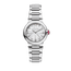 Lvcea watch with quartz movement, hours and minutes functions, 28 mm polished stainless steel case, white mother-of-pearl intarsia marquetry dial, 12 round brilliant-cut diamond indexes and cabochon-cut synthetic pink sapphire crown set with a diamond. Polished and satin-brushed stainless steel bracelet with folding buckle. Water-resistant up to 50 meters.