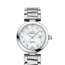 The attractive dial is made with white pearled, mother-of-pearl, to accentuate the feminine touch. The polished alpha-shaped hands have been crafted with white gold, along with 11 indexes, which are set with diamonds. Central second hand. The date window is located at the 3 o'clock position.