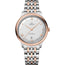 The domed silvery dial features a crystal finish. The display is distinguished by PVD Sedna™ Gold coloured hands, as well as alternating Roman numerals and cabochon indexes.