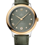 A sapphire crystal protects the front and back side of the watch. Green alligator leather strap with steel buckle. While the watch’s water-resistance up to 30 m ensures durability.