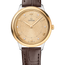 The PVD Moonshine™ Gold dial features a stamped random vertical pattern in a sun-brushed finish. The display is distinguished by yellow gold-plated hands, as well as alternating Roman numerals and cabochon indexes.