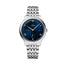 The domed PVD dark blue dial features a sun-brushed finish. The display is distinguished by rhodium-plated hands, as well as alternating Roman numerals and cabochon indexes.