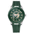 A sapphire crystal protects the front and back side of the watch. Green rubber strap with folding clasp. While the watch’s water-resistance up to 150 m ensures durability.