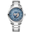 Around the dial is a circle of silvery printed global destinations. The centre contains a 24-hour glass ring, with light blue to indicate daytime and dark blue to indicate night. The vision of Earth, which depicts a blue ocean and relief of the continents, is laser-ablated on a grade 5 titanium plate.