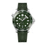 The watch is presented on a green rubber strap and is driven by the OMEGA Master Chronometer Calibre 8800, which can be seen through the sapphire-crystal on the wave-edged caseback.