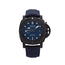 This Panerai Submersible QuarantaQuattro is crafted in a Carbotech case measuring 44mm with an anti-clockwise rotating Carbotech bezel. The blue dial features luminous hour markers and dots, date at 3 o’clock, and small seconds at 9 o’clock. The watch comes on a fabric bracelet and extra rubber straps.