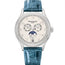 Patek Philippe 4947G-010 The Patek Philippe Complications 4947G-010 is a stunning timepiece that combines exceptional mechanical movement with exquisite design. The watch is powered by the mechanical self-winding movement Caliber 324 S QA LU, which ensures accurate and reliable timekeeping. The watch features several complications, including a date window at the 6 o'clock position, a day of the week indicator at the 10 o'clock position, and a month indicator at the 2 o'clock position. The bezel is set with 141 diamonds weighing approximately 1.28 carats, adding to the watch's luxurious appeal. The crown is also set with 14 diamonds, weighing approximately 0.06 carats, further enhancing the watch's beauty. The silvery dial has both horizontal and vertical satin finishes, with gold applied numerals providing excellent legibility. The alligator strap with square scales is hand-stitched and has a shiny peacock blue color that adds to the watch's sophistication. The strap is fastened with a prong buckle, ensuring a secure fit. The watch has a white gold case with a diameter of 38mm, which is water-resistant to 30 meters. The sapphire-crystal case back allows the wearer to admire the intricate movement of the watch, while the overall design exudes luxury and refinement. The Patek Philippe Complications 4947G-010 is a true masterpiece that combines stunning design with practical functionality, making it an excellent choice for those who appreciate fine watches.