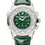 5930P Patek Philippe The Patek Philippe Complications Chronograph World Time 5930P is a masterpiece presented in a 39.5 mm platinum case, boasting a fixed platinum bezel. The mesmerizing green dial features a hand-guilloched circular motif at the center, enhancing its visual appeal. Arabic numerals and gold applied hour markers with luminescent coating ensure excellent legibility, complemented by gold hour hands also coated with luminescence. The day/night indication adds both functionality and charm to the dial. This exceptional watch is ingeniously designed with a World Time mechanism, making it remarkably user-friendly with just one time-zone selector. The chronograph hand, thanks to the minimal-friction vertical clutch, serves as a permanently running second hand as well. The movement, finished according to the stringent directives of the Patek Philippe Seal, boasts groundbreaking innovations such as the patented Spiromax® balance spring, enhancing isochronism. The 30-minute counter is positioned at the 6 o'clock position. The watch offers a range of functions, including hours, minutes, city disk, 24-hour disk (day/night indication with colors and sun/moon symbols), world time, flyback chronograph, and central chronograph hand. The self-winding mechanical movement, Calibre CH 28?520 HU, powers the timepiece, ensuring a generous power reserve of approximately 55 hours. With a case thickness of 12.86 mm, this watch strikes a balance between elegance and substance. The transparent case back and sapphire crystal protecting the front and back sides allow for a captivating view of the intricate movement. The green alligator leather strap with a fold-over clasp adds to the overall aesthetics and comfort. With a water resistance of up to 30 meters, the Patek Philippe Complications Chronograph World Time 5930P stands as a testament to horological innovation and craftsmanship.