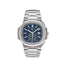 Celebrating the 40th Anniversary, the Patek Philippe Nautilus 44mm design is deemed as what is the largest case featured in the family of the Nautilus. The blue dial features baguette diamond-set indexes surrounded by a white gold bezel. The watch is finished with a sapphire-crystal back and white gold bracelet with fold-over clasp.