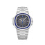 This Patek Philippe Nautilus is crafted in a 40mm platinum case, illuminated with a gem-set blue sapphire bezel, and styled on a platinum bracelet. The black dial hosts baguette-cut blue sapphire hour markers and a date window at 3 o'clock.