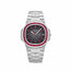 This Patek Philippe Nautilus 5711/112P-001 is designed in a 40mm platinum case and styled on a platinum bracelet. The bezel is adorned with 32 baguette rubies and surrounds a grey dial with luminous hands, baguette ruby hour markers, and a date window at 3 o'clock. This rare timepiece is coveted among collectors and is certainly a treasure.