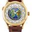The white dial features yellow gold-tone hands and a stunning world map centerpiece, making it a truly unique and eye-catching accessory. The world timer function elegantly displays the time across 24 different time zones, perfect for the discerning traveler. Additionally, the day/night indicator adds a layer of functionality that is as useful as it is beautiful.