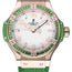 Preowned-361.PG.2010.LR.1922 Hublot. The Hublot Big Bang Tutti Frutti 361.PG.2010.LR.1922 is a luxury wristwatch with a 38mm case made of 18K rose gold. The fixed bezel is secured with six screws and set with 48 baguette-cut green tsavorite mineral stones, which add to the watch's unique and striking appearance. The flat white dial features Arabic numeral and index hour markers, with semi-skeleton rose gold hands with luminous-filled tips. Minute markers can be found around the outer rim of the dial. The watch is equipped with a green rubber and alligator leather strap, providing both comfort and durability, with a folding clasp for easy wear. The quartz movement of the watch is powered by a HUB2900 caliber, ensuring precise and reliable timekeeping. The watch is water-resistant up to 100 meters or 330 feet, making it suitable for swimming and snorkeling, but not for scuba diving. Overall, the Hublot Big Bang Tutti Frutti 361.PG.2010.LR.1922 is an exceptional timepiece, combining luxurious design elements with reliable functionality, making it an excellent choice for those who appreciate high-quality watches.