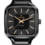 The True Square has a diameter of 38 mm and consists of a polished black high-tech ceramic case and crown and a flat sapphire crystal. Thanks to a Rado R763 automatic movement, the watch keeps precise and reliable time. The rose gold coloured hands and indexes with white Super-LumiNova® match perfectly with the dial that includes a black stamped horizontal structure. The watch is equipped with 80 hours of power reserve and has a water resistance of 5 bar. The pleasant wearing comfort of the True Square is ensured by a black polished high-tech ceramic bracelet with a titanium 3-fold clasp.