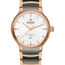 The classic Centrix Automatic has been reworked not only technically, but also aesthetically. The modified model has a rounded sapphire crystal that extends all the way to the edge and a curved case blending with the curved crystal edge. The overall appearance of this iconic timepiece is completed with adjusted case lugs and a bracelet made of polished rose-gold-coloured PVD-coated stainless steel with plasma high-tech ceramic middle links. The silver sunray dial with rose-gold-coloured applied indexes matches perfectly with the rose-gold-coloured hands. Inside, the three-hand calibre R582 movement exceeds standard accuracy test requirements from 3 to 5 positions, thanks to its antimagnetic Nivachron™ hairspring for increased reliability and accuracy. The watch is water resistant down to 50 m and offers 48 hours of power reserve.