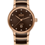 The classic Centrix Automatic Diamonds watch has been reworked not only technically, but also aesthetically. The modified model has a rounded sapphire crystal that extends all the way to the edge and a curved case blending with the curved crystal edge. The overall appearance of this iconic timepiece is completed with adjusted case lugs and a bracelet made of polished rose-gold-coloured PVD-coated stainless steel with brown high-tech ceramic middle links. The brown facetted dial has an opulent 3D effect created by stamping a shaped dial and then filling it with lacquer. Inside, the three-hand calibre R582 movement exceeds standard accuracy test requirements from 3 to 5 positions, thanks to its antimagnetic Nivachron™ hairspring for increased reliability and accuracy. The watch is water resistant down to 50 m and offers 48 hours of power reserve.