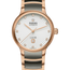 The classic Centrix Automatic Diamonds watch has been reworked not only technically, but also aesthetically. The modified model has a rounded sapphire crystal that extends all the way to the edge and a curved case blending with the curved crystal edge. The overall appearance of this iconic timepiece is completed with adjusted case lugs and a bracelet made of polished rose-gold-coloured PVD-coated stainless steel with plasma high-tech ceramic middle links. The silver-white facetted dial has an opulent 3D effect created by stamping a shaped dial and then filling it with lacquer. Inside, the three-hand calibre R582 movement exceeds standard accuracy test requirements from 3 to 5 positions, thanks to its antimagnetic Nivachron™ hairspring for increased reliability and accuracy. The watch is water resistant down to 50 m and offers 48 hours of power reserve.