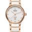 The Classic Centrix Automatic Diamonds watch has been reworked not only technically, but also aesthetically. The modified model has a rounded sapphire crystal that extends all the way to the edge and a curved case blending with the curved crystal edge. The overall appearance of this iconic timepiece is completed with adjusted case lugs and a bracelet made of polished rose-gold-coloured PVD-coated stainless steel with white high-tech ceramic middle links. The silver facetted dial has an opulent 3D effect created by stamping a shaped dial and then filling it with lacquer. Inside, the three-hand calibre R582 movement exceeds standard accuracy test requirements from 3 to 5 positions, thanks to its antimagnetic Nivachron™ hairspring for increased reliability and accuracy. The watch is water resistant down to 50 m and offers 48 hours of power reserve.