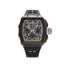 The Richard Mille RM 11-03 is designed in a 50mm black ceramic and titanium case, styled on a rubber strap. An inner ivory ring surrounds a skeletonized case that offers a glimpse into the intricate mechanics of the watch. Complications include analog time function, flyback chronograph, 60-minute countdown timer and an oversized date display. The black rubber bracelet embodies the brand's signature racing aesthetic.