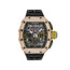 The Richard Mille RM 11-03 is designed in a 50mm rose gold case and styled on a rubber strap. It features a skeletonized dial with white numerals, offering analog time function, flyback chronograph, 60-minute countdown timer and oversized date display. The black rubber bracelet embodies the brand's signature racing aesthetic.