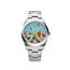 This Oyster Perpetual is crafted in a stainless steel case measuring 41mm in diameter with a smooth domed bezel. The turquoise blue dial features the new "Celebration Motif" design which represents the vivid colors of lacquered dials introduced years earlier.