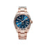 The uni-directional rotating bezel in 18k Everose Gold adds a touch of opulence, perfectly complemented by the striking blue rhodium dial. This dial is adorned with gold-tone hands and hour markers, ensuring effortless readability and a refined aesthetic. The date window at 3 o'clock provides clear and convenient date tracking.