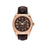 This Rolex Sky-Dweller 326135 is inlaid in a 42mm 18k rose gold case surrounding a chocolate brown dial styled on a leather strap. A unique Ring Command bezel sets the features, including a dual-time zone and annual calendar capabilities. Luminous hour markers and a fixed red triangle indicate the chosen reference time. Arabic numeral indexes add an elegant and professional touch.