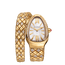 Combining the audacity of Serpenti and the legend of Spiga, the Italian word for "spike", the Serpenti Spiga watch in 18 kt yellow gold joins contemporary design with Roman inspiration. To echo the idea of infinity, its coiling single-spiral bracelet is carved with an abstract wheat stalk pattern, partially set with brilliant-cut diamonds. A white mother-of-pearl dial encircled by a diamond-set bezel exalts the refined preciousness of the timepiece that embodies both Bvlgari’s jewelry artistry and watchmaking savoir-faire.