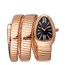 Merging two of the most iconic symbols of Bvlgari design, the Serpenti Tubogas watch coils the sinuosity of the snake with the contemporary soul of tubogas. Evoking both the sensual curves of a woman and the fluid shape of the serpent, the timepiece is crafted with the shapely lines of this specific technique, with a flexible and tubular litheness. Radiating glamour and a truly individual style, this watch marks a distinctive chapter in the constant evolution of Serpenti. Serpenti Tubogas watch with quartz movement, 35 mm 18 kt rose gold curved case set with brilliant cut diamonds, 18 kt rose gold crown set with a cabochon cut pink rubellite, black opaline dial with guilloché soleil treatment and hand-applied indexes, 18 kt rose gold double spiral bracelet.