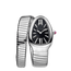Merging two of the most iconic symbols of Bvlgari design, the Serpenti Tubogas watch coils the sinuosity of the snake with the contemporary soul of tubogas. Evoking both the sensual curves of a woman and the fluid shape of the serpent, the timepiece is crafted with the shapely lines of this specific technique, with a flexible and tubular litheness. Radiating glamour and a truly individual style, this watch marks a distinctive chapter in the constant evolution of Serpenti. Serpenti Tubogas watch with quartz movement, 35 mm stainless steel curved case, stainless steel crown set with a cabochon cut pink rubellite, black opaline dial with guilloché soleil treatment, single spiral stainless steel bracelet.