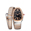 Merging two of the most iconic symbols of Bvlgari design, the Serpenti Tubogas watch coils the sinuosity of the snake with the contemporary soul of tubogas. Evoking both the sensual curves of a woman and the fluid shape of the serpent, the timepiece is crafted with the shapely lines of this specific technique, with a flexible and tubular litheness. Radiating glamour and a truly individual style, this watch marks a distinctive chapter in the constant evolution of Serpenti. Serpenti Tubogas watch with quartz movement, 35 mm stainless steel curved case, 18 kt rose gold bezel set with brilliant cut diamonds, 18 kt rose gold crown set with a cabochon cut pink rubellite, black opaline dial with guilloché soleil treatment and hand-applied indexes, single spiral 18 kt rose gold and stainless steel bracelet.