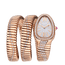 Merging two of the most iconic aesthetic signatures of Bvlgari’s creativity, the Serpenti Tubogas Infiniti double-spiral watch in 18 kt rose gold coils the sinuosity of the snake with the contemporary soul of Tubogas. The head of the mythical animal is rendered by a diamond-set case and a full pavé dial, while the mesmerising suppleness of the bracelet evokes the fluid lines of the serpent’s flexuous body. As a symbol of Serpenti’s endless metamorphosis, a serpentine silhouette in brilliant-cut diamonds extends from the watch’s head to the tail.