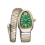 Tadao Ando x Bvlgari Serpenti Tubogas Limited Edition watch with quartz movement, hours and minutes functions, 35 mm stainless steel case, 18 kt yellow gold bezel set with 38 diamonds (0.29 ct), 18 kt yellow gold crown set with a cabochon-cut green aventurine, green aventurine dial, yellow gold-plated hands, single-spiral bracelet in stainless steel and 18 kt yellow gold, caseback personalized with Tadao Ando's signature and "Tadao Ando Limited Edition" engraving. Size 135 mm. Water-resistant up to 30 meters.