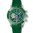 The lacquered green dial and three different-coloured sub-dials. Minute markers around the outer rim. Luminous hour markers. Silvery hour hands with luminous coating. Date window located between the 4 and 5 o'clock positions. This watch has three chronograph sub-dials at 3 ,6 and 9 o'clock.