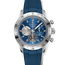 The blue dial and three different-coloured sub-dials. Minute markers around the outer rim. Luminous hour markers. Silvery hour hands with luminous coating. Date window located between the 4 and 5 o'clock positions. This watch has three chronograph sub-dials at 3 ,6 and 9 o'clock.