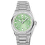 16.9400.670/61.I001 Zenith. The Zenith Defy Skyline 16.9400.670/61.I001 is an elegant and luxurious ladies' watch that boasts a stunning design and high-end features. The watch features a 36mm steel octagonal case with a faceted 52 WS brilliant-cut diamond-set bezel, adding a touch of glamour to its overall appearance. The metallic pastel green sunburst-patterned dial revisits the emblematic ZENITH four-pointed star, giving the watch a unique and distinctive look. The watch is powered by the Elite 670 automatic manufacture movement, which is known for its accuracy and reliability. The watch comes with an interchangeable steel bracelet and green patterned rubber strap, making it versatile and easy to match with different outfits. The light green-toned sunray-patterned dial features rhodium-plated, faceted, and coated hands and hour markers with SuperLuminova SLN C1, making it easy to read time even in low light conditions. The domed sapphire crystal with anti-reflective treatment on both sides protects the dial from scratches and damages. The transparent sapphire crystal case back allows you to see the movement of the watch, which is a rare feature in ladies' watches. The watch functions include hours and minutes in the center, a central seconds hand, and a date indication at 3 o'clock, making it a useful accessory for everyday use. The watch is water-resistant up to 200m/20 bar, making it suitable for swimming and water sports. Overall, the Zenith Defy Skyline 16.9400.670/61.I001 is a luxurious and elegant ladies' watch that combines stunning design with high-end features. With its diamond-set bezel, advanced features, and high-quality materials, it is a perfect accessory for any woman who wants to make a statement with her watch.
