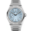 A sapphire crystal protects the front and back side of the watch. Interchangeable steel bracelet and ice blue patterned rubber strap. While the watch’s water-resistance up to 100 m ensures durability.