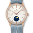22.3200.692/01.C832 Zenith The Zenith Elite Moonphase 22.3200.692/01.C832 is a luxurious ladies' watch with a 36mm 18K Rose Gold case and diamond bezel, giving it a striking and elegant appearance. The silver dial features gold-tone hands and index hour markers, adding to its classic and timeless look. The watch has a unique and functional complication in the form of a moonphase indication at 6 o'clock, which displays the phases of the moon. Additionally, the small seconds subdial is positioned at the 9 o'clock position, adding balance and symmetry to the dial. The blue alligator leather strap is comfortable and durable, with a protective rubber lining for added longevity. The 18K Rose Gold pin buckle adds to the overall luxurious look of the watch. The watch is powered by an automatic movement with a power reserve of up to 50 hours, making it reliable and convenient for daily wear. It is also water-resistant up to 50 meters (165 feet), providing protection against accidental splashes of water and making it suitable for swimming. Overall, the Zenith Elite Moonphase 22.3200.692/01.C832 is a beautiful and functional ladies' watch that combines luxury with practicality. The moonphase indication and small seconds subdial add to its functionality, while the diamond bezel and 18K Rose Gold case give it a touch of elegance and sophistication.